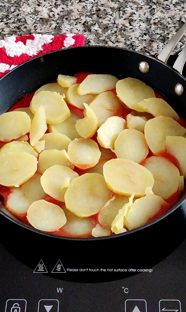 Die gekochten Kartoffeln in Scheiben von ca. 0,4-0,5 cm Dicke schneiden. Die Kartoffelscheiben in der Sauce anrichten.