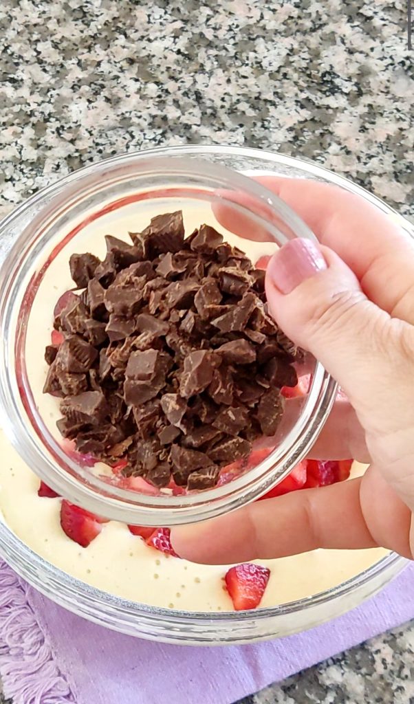 Wascht die Erdbeeren, putzt sie und schneidet sie in Würfel. Schneidet auch die Zartbitterschokolade in kleine Stücke oder verwendet Schokoladentropfen.