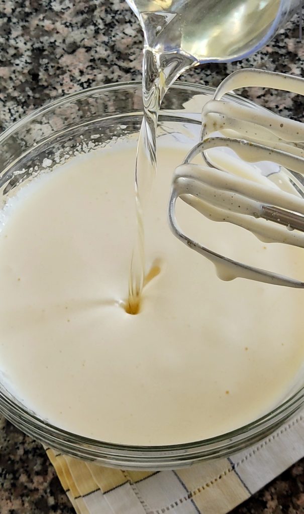 Fügen Sie das Sonnenblumenöl und einen Becher Pfirsichjoghurt hinzu. Mischen Sie.