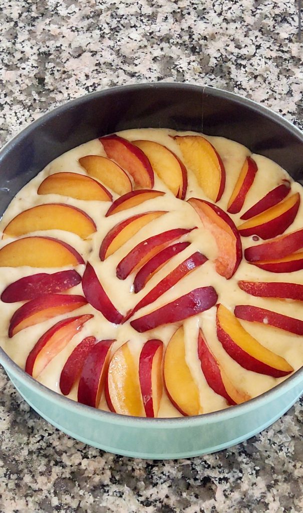 Ordnen Sie die Pfirsichscheiben in konzentrischen Kreisen auf der Oberfläche an und lassen Sie sie leicht in den Teig einsinken. Backen Sie den Pfirsichkuchen im vorgeheizten Ofen bei 180°C im statischen Modus für 35-40 Minuten.