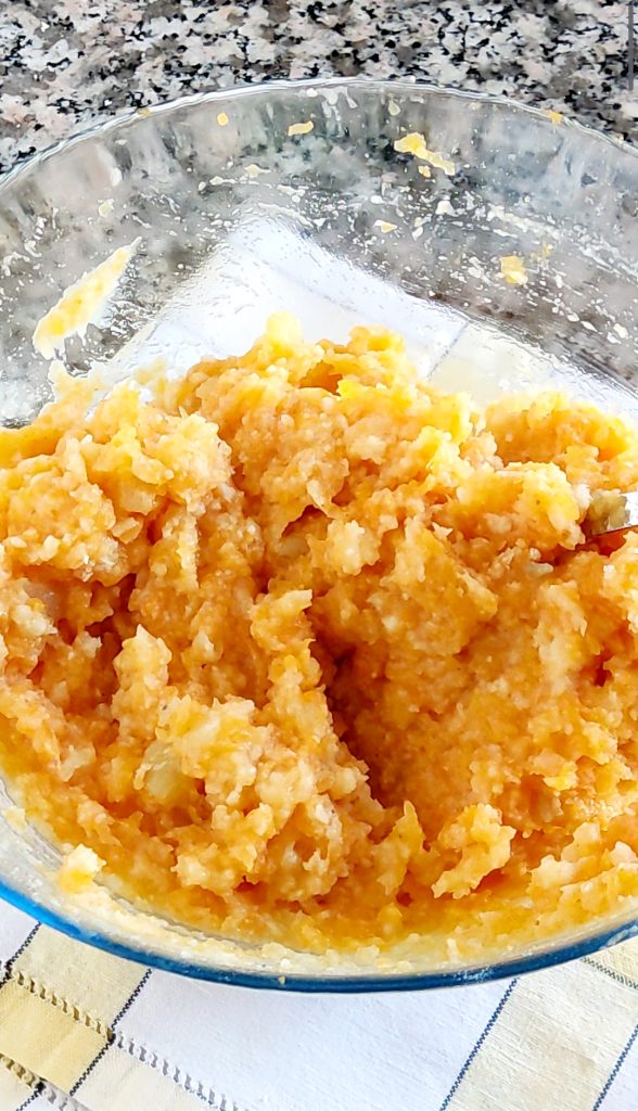 Gebt den gekochten Kürbis und die Kartoffeln in eine Schüssel und zerdrückt sie mit einer Kartoffelpresse zu Püree.