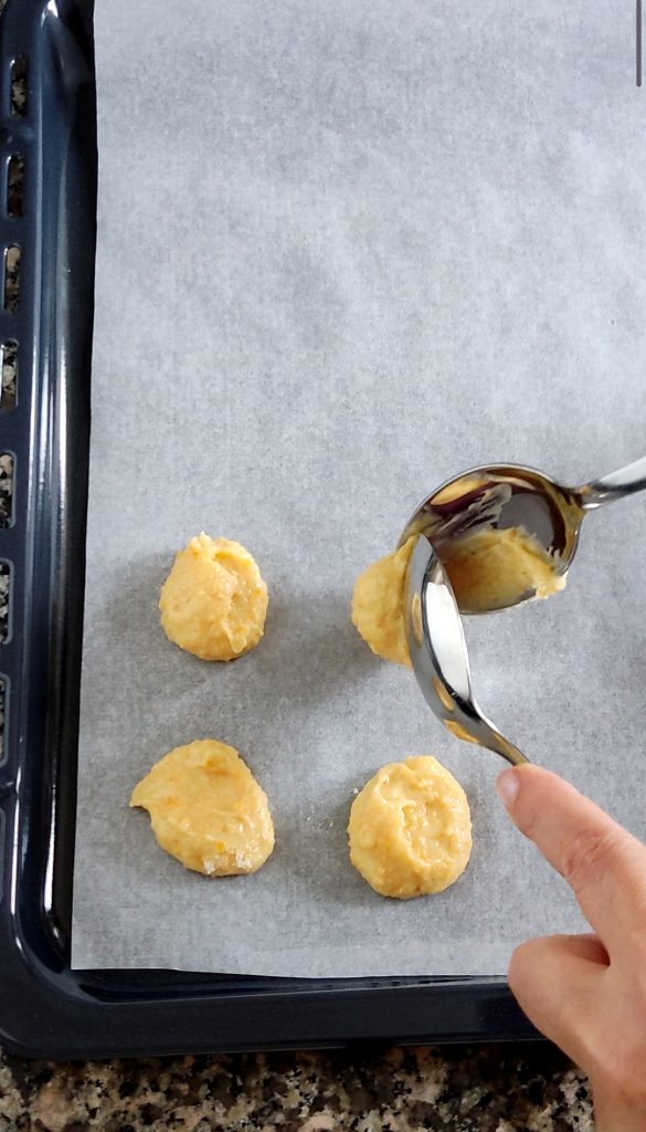 Ein Backblech mit Backpapier auslegen. Mit 2 Löffeln kleine Teighäufchen mit ein wenig Abstand darauf setzen. Mit Puderzucker bestäuben.
