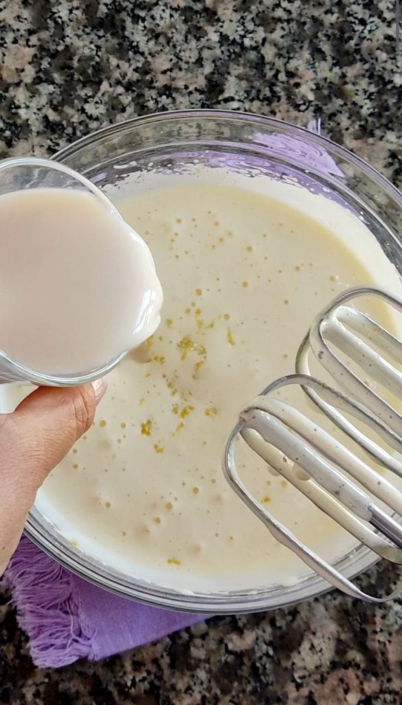 Fügt die abgeriebene Zitronenschale, den Zitronensaft, das Öl und die Milch hinzu. Vermischt alles gut.