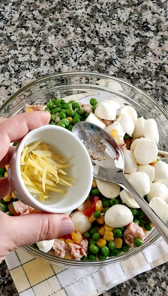 Würzen Sie die Nudeln mit den Zitronenschalen und dem Zitronensaft. Fügen Sie auch 3-4 Esslöffel Olivenöl hinzu und mischen Sie gut mit Hilfe von 2 Löffeln. Decken Sie die Schüssel mit Frischhaltefolie ab und lassen Sie den kalten Nudelsalat für mindestens eine Stunde im Kühlschrank abkühlen.