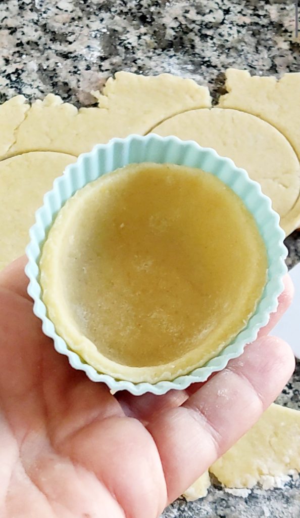 Mit den Mürbeteigscheiben legst du Silikon-Muffinförmchen aus. Drücke leicht, um den Teig an den Förmchen haften zu lassen.