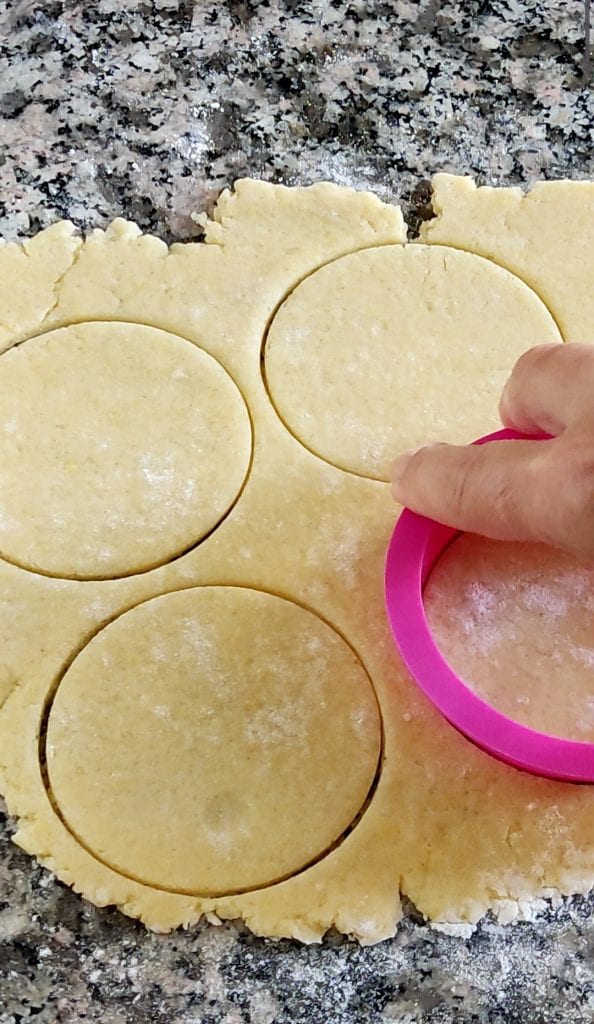 Rolle den Mürbeteig auf der bemehlten Arbeitsfläche auf eine Dicke von 0,3-0,4 cm aus. Schneide mit einer runden Ausstechform oder einem Ausstecher von etwa 8 cm Durchmesser viele Teigscheiben aus.