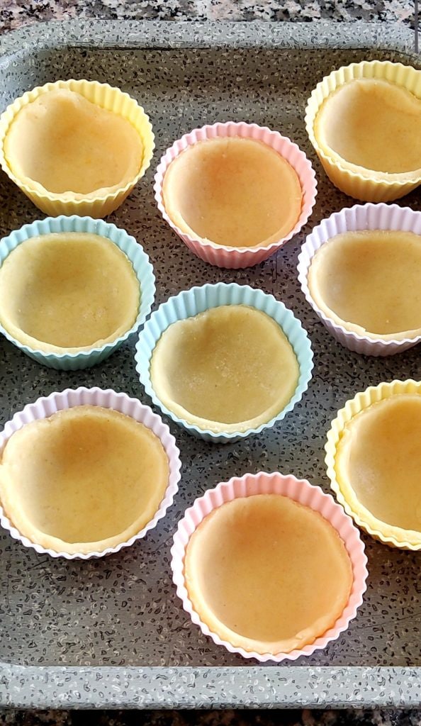 Mit den Teigscheiben die Silikon-Muffinförmchen auskleiden. Drücke leicht, um den Teig an die Förmchen anzupassen.