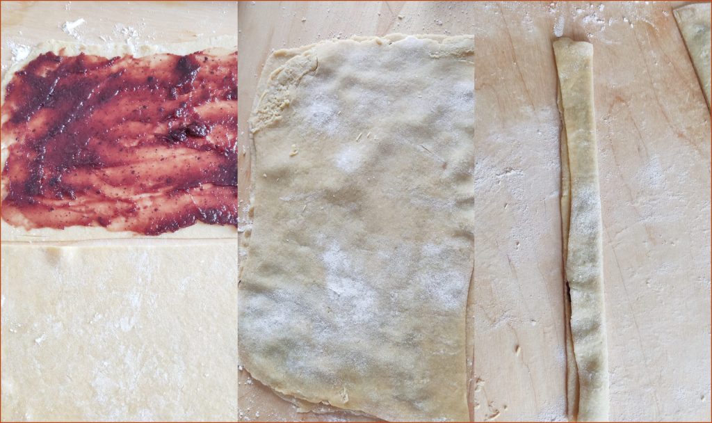 Rollen Sie den Mürbeteig auf einer leicht bemehlten Arbeitsfläche aus, um ein großes Rechteck von etwa 14-15 cm an der kürzeren Seite zu formen. Teilen Sie es in der Mitte der längeren Seite. Bestreichen Sie eine Hälfte mit der Waldfruchtmarmelade.
