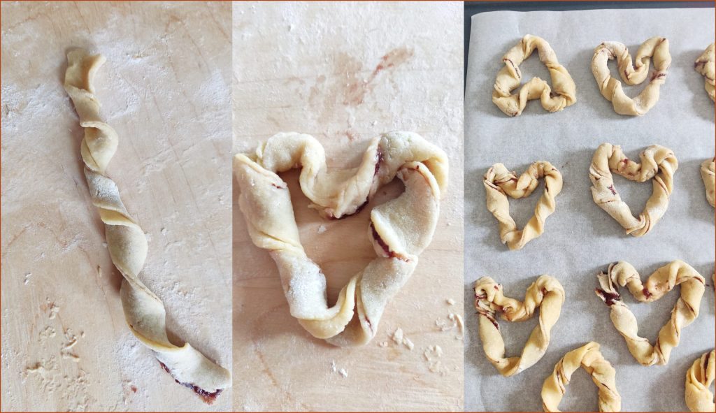 Decken Sie es mit dem anderen Mürbeteig ab. Schneiden Sie mit einem Teigrad etwa 1,5 cm breite Streifen ab. Rollen Sie jeden Streifen auf sich selbst und versuchen Sie dann, eine Herzform zu geben, indem Sie die beiden Enden zusammenführen.