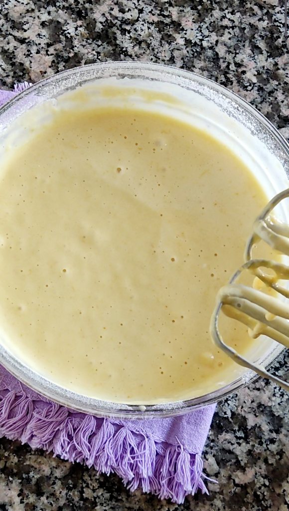 Fahren Sie mit der Zubereitung fort, indem Sie das gesiebte Mehl und das Backpulver hinzufügen. Mischen Sie gut, um alle Zutaten zu verbinden.