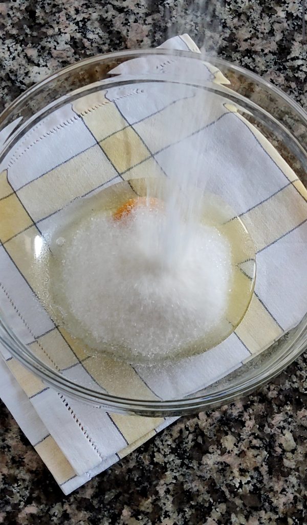 Um dieses Dessert zuzubereiten, wählt eine unbehandelte Orange aus, damit ihr sowohl die Schale als auch den Saft verwenden könnt. Schlagt in einer Schüssel ein Ei mit dem Zucker auf.