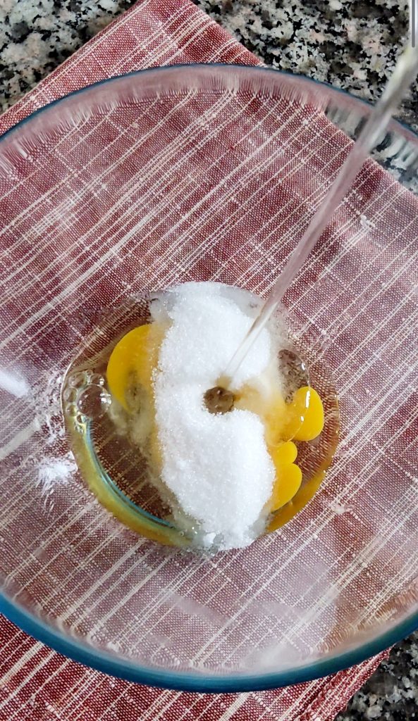 Die Birne schälen und in kleine Würfel schneiden. In einer Schüssel das Ei mit dem Zucker vermischen.
