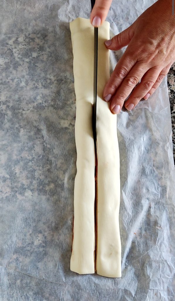 Teilen Sie die Rolle der Länge nach in der Hälfte. Flechten Sie die beiden Teile.