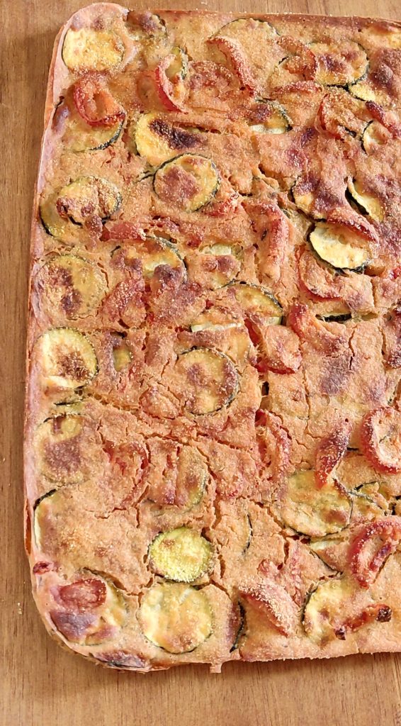 Fladen mit Kichererbsenmehl knusprig und lecker. Viele Gemüse machen meinen Gemüseschiacciata besonders, zu dem ich auch Kichererbsenmehl hinzugefügt habe, um ihn auch glutenfrei zu machen. Ein dünner, knuspriger und würziger Herzhaftkuchen, der wirklich einfach zuzubereiten ist. Für das Gemüse habe ich Zucchini und Kirschtomaten verwendet, aber wenn Sie möchten, können Sie auch andere Gemüse hinzufügen. Paprika und Auberginen eignen sich hervorragend, in kleine Stücke geschnitten und einfach 7-8 Minuten in einer Pfanne mit etwas Olivenöl gebraten. Sie können auch hauchdünn geschnittene Zwiebeln hinzufügen. Ich habe die Zucchini dünn geschnitten und die Kirschtomaten in kleine Stücke geschnitten und dann dem Teig aus Wasser und Kichererbsenmehl hinzugefügt. Eine dünne Schicht, die im Ofen knusprig wird. Das Bestäuben mit einer Prise Maismehl vor dem Backen verleiht eine besondere und unverwechselbare Knusprigkeit, die es wirklich unwiderstehlich macht. Was meinen Sie, macht Sie die Idee neugierig? Dann los in die Küche und bereiten wir gemeinsam den Fladen mit Zucchini und Kirschtomaten zu.