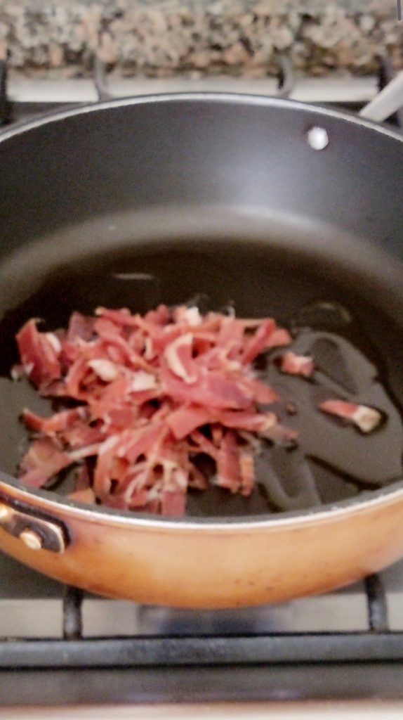 Gebt das Olivenöl in eine Pfanne. Fügt den in Streifen geschnittenen Speck hinzu und lasst ihn bei mittlerer Hitze 1-2 Minuten anbraten, dabei oft mit einem Holzlöffel umrühren.