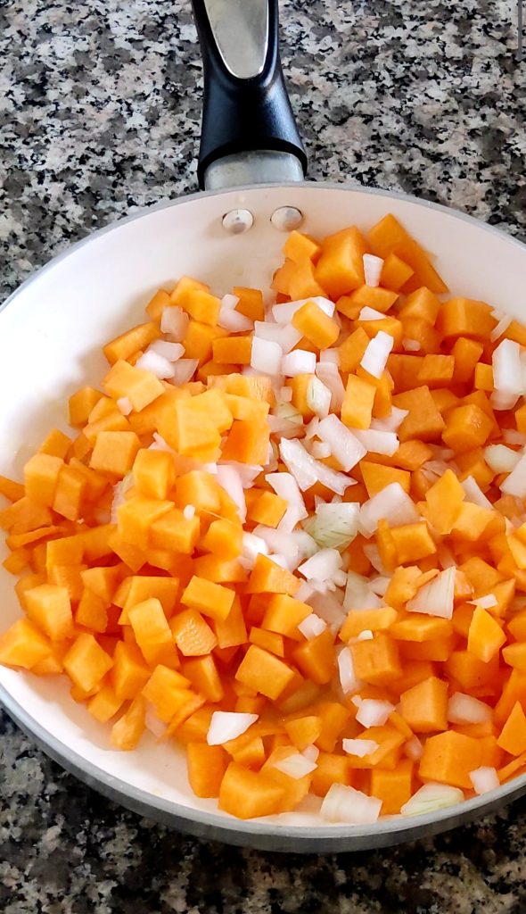 Geben Sie 2-3 Esslöffel Olivenöl in eine Pfanne. Fügen Sie den Kürbis, die Zwiebel und eine Prise Salz hinzu. Lassen Sie es bei mittlerer Hitze unter häufigem Umrühren mit einem Holzlöffel für 10-12 Minuten kochen.