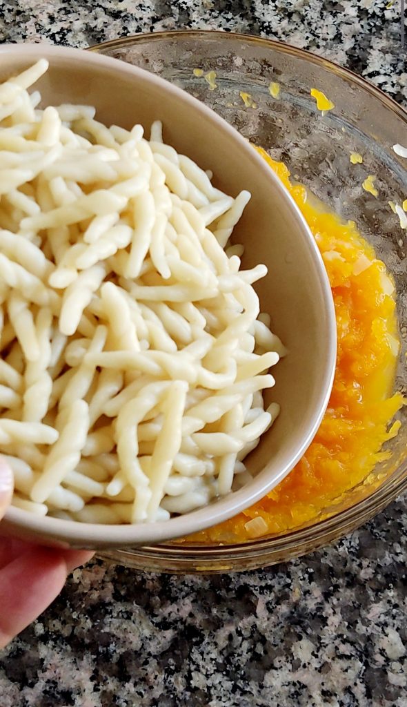 Fügen Sie die Trofie in die Schüssel mit der Kürbiscreme. Mischen Sie und fügen Sie auch die Béchamel hinzu.
