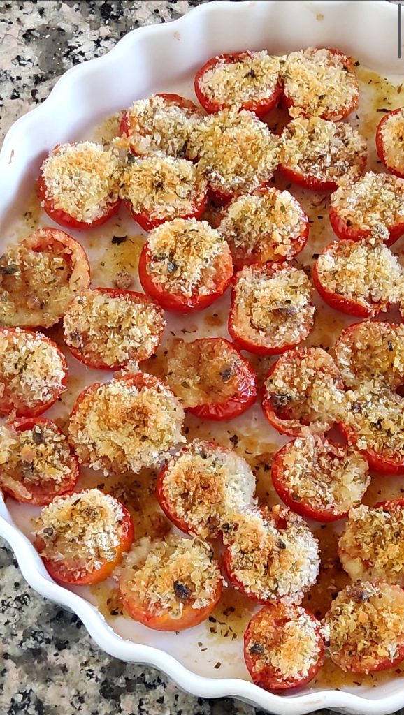 Überbackene Kirschtomaten sind einfach zuzubereiten und köstlich. Das Rezept, das ich euch heute erzählen möchte, ist ein einfaches Rezept, um Kirschtomaten auf eine raffinierte und besondere Weise zuzubereiten. Süße Kirschtomaten, gefüllt mit einer einfachen und schmackhaften Panade, die dann im Ofen gratiniert werden. Sie sind so gut, dass sie bei mir zu Hause im Nu verschwunden waren. Ich gestehe, dass ich sie sogar gegessen habe, während ich das Foto gemacht habe! Sie sind in wenigen Minuten zubereitet und verschwinden im Handumdrehen! Die Ofentomaten sind eine perfekte Beilage zu Fleisch- oder Fischgerichten. Nutzt also die süßen Kirschtomaten, die jetzt genau in ihrer Saison sind, und bereiten wir zusammen die Überbackenen Kirschtomaten zu