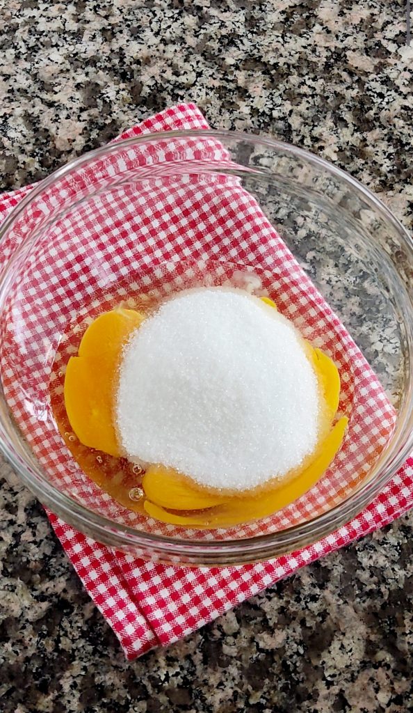 Schlagen Sie die 2 ganzen Eier mit dem Zucker mit einem elektrischen Handmixer für 6-7 Minuten, bis die Masse hell und schaumig ist.