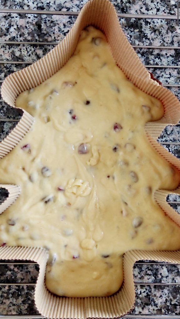 Den Ofen auf 180°C vorheizen. Den Teig in eine Backform aus Papier in der Form eines Weihnachtsbaumes gießen. Zuckerstreusel auf der Oberfläche verteilen.