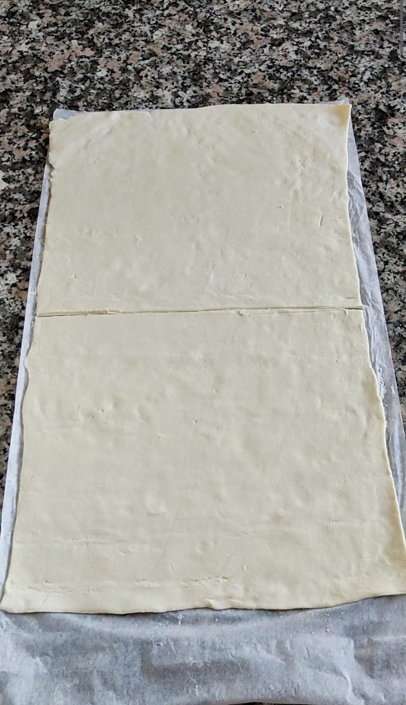 Den rechteckigen Blätterteig auf der Arbeitsfläche ausrollen und in 2 Teile teilen. Die Hälfte des Blätterteigs mit Nutella bestreichen.