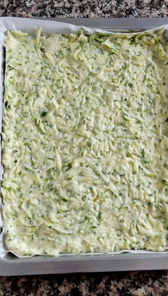 Die Zucchini und Zwiebeln in den Teig geben und gut vermischen, um sie in den Teig einzuarbeiten.