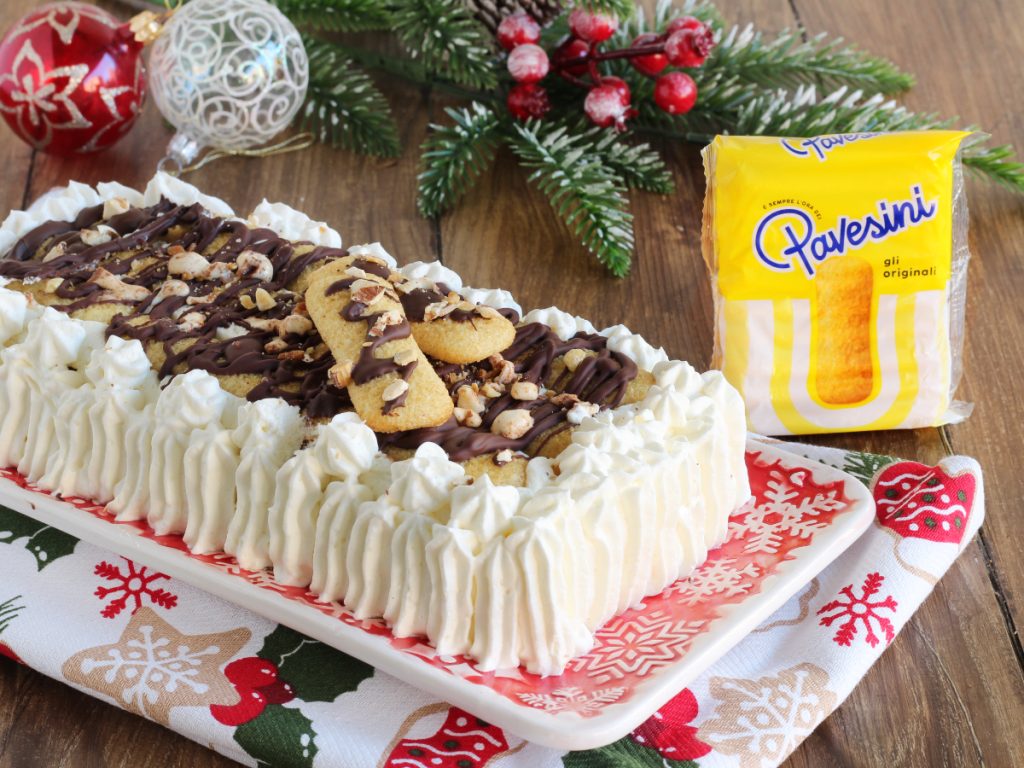 Köstliche Schichten aus Pavesini Gli Originali Keksen, zarter Mascarpone-Torrone-Creme, Stückchen dunkler Schokolade und Schlagsahne – ein besonderes Dessert, um das Weihnachts- oder Silvesteressen noch genussvoller zu beenden.