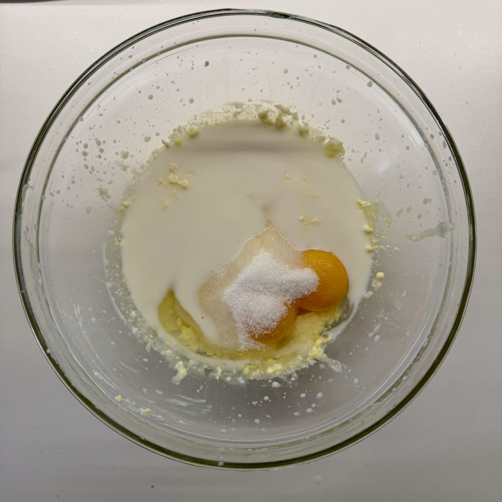 • Fügen Sie die Eier und den Zucker hinzu. Mischen Sie schnell mit dem Mixer.