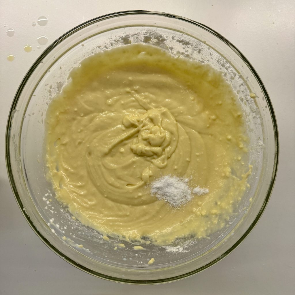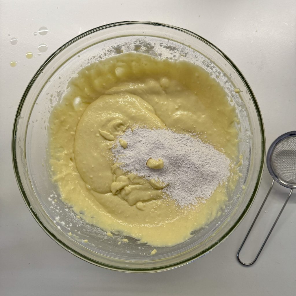 • Fügen Sie das Mehl, das gesiebte Backpulver und das Salz hinzu und mixen Sie nur so lange, bis alle Zutaten verbunden sind.