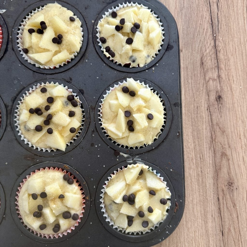 Füllen Sie die Papierförmchen mit der Mischung, indem Sie sie zu 3/4 oder etwas mehr füllen. Dekorieren Sie die Oberfläche mit den letzten Apfelstückchen und einigen weiteren Schokoladenstückchen.