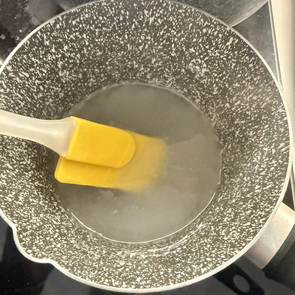 Stellt den Topf auf den Herd und rührt bei niedriger Hitze, bis die Gelatine eindickt. Das dauert etwa 2-3 Minuten.