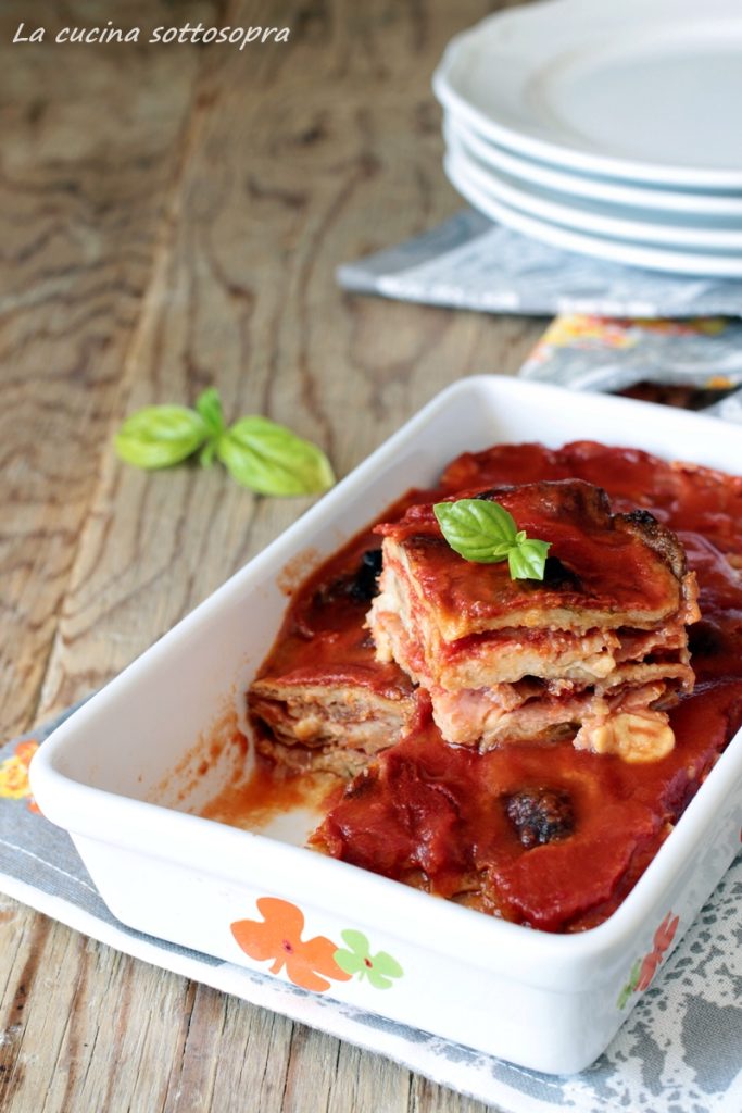Die Auberginen-Parmigiana auf apulische Art unterscheidet sich von der klassischen Version, weil die Auberginen nicht nur frittiert werden, sondern entweder in Teig frittiert oder zuerst in Mehl und dann in geschlagenem Ei gewendet werden. Außerdem werden sie zusätzlich entweder mit vorher in der Pfanne angebratenem Hackfleisch oder mit gekochtem Schinken oder Mortadella bereichert. Wenn Sie das Originalrezept der Auberginen-Parmigiana auf apulische Art suchen, ist es wirklich schwer zu finden, da – wie man so sagt – „Apulien lang ist“ und jede Gegend in Apulien ihre eigene Version hat: Ich bereite sie normalerweise mit gekochtem Schinken oder einer Mischung aus gekochtem Schinken und Mortadella zu. Wenn ich keine Lust zum Frittieren habe, bereite ich stattdessen den Auberginenauflauf aus dem Ofen zu, da man es nicht frittierte Parmigiana zu nennen, wäre eine Ketzerei!