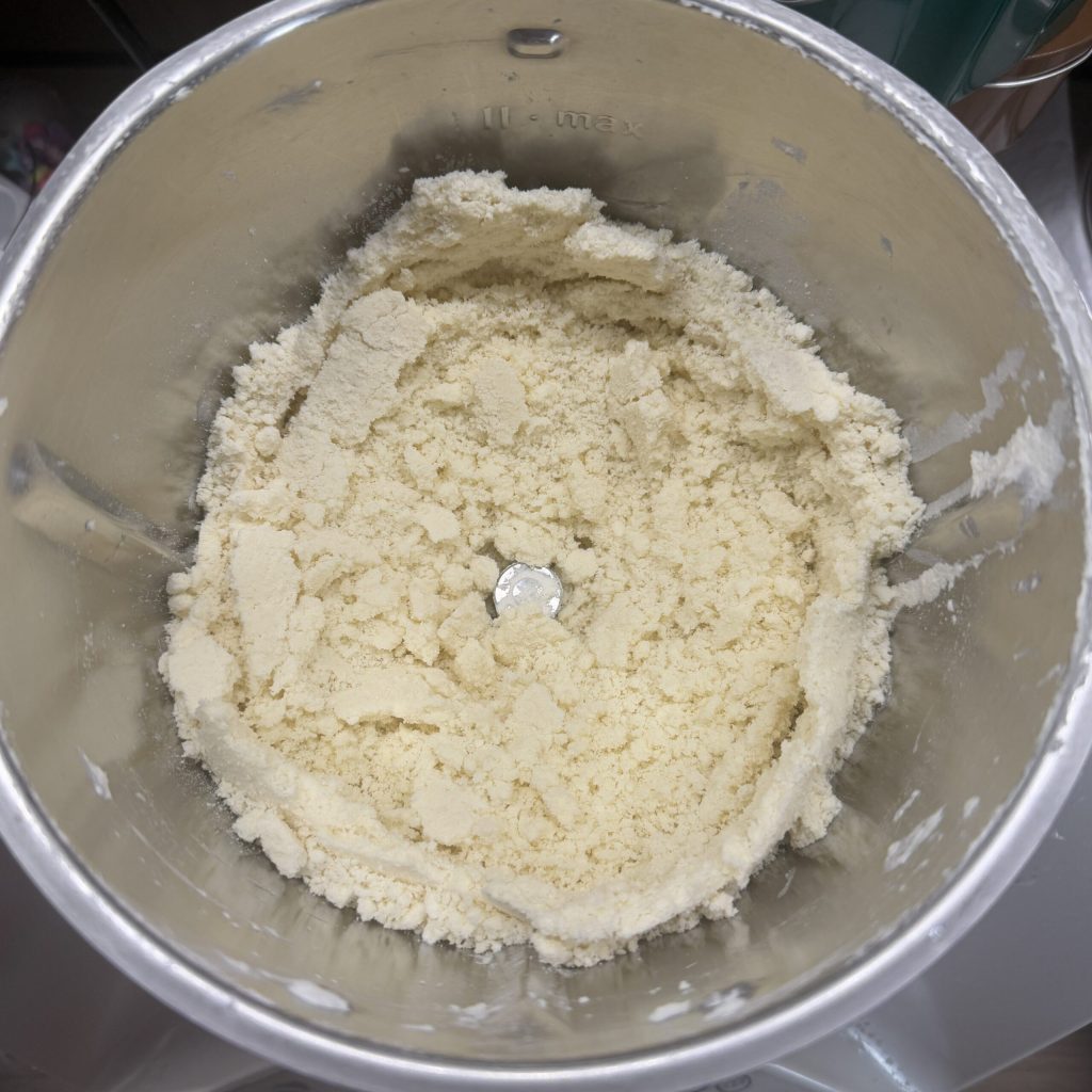 Fügen Sie die kalte Butter in Stücken hinzu und mixen Sie ein paar Sekunden, bis Sie eine „sandige“ Konsistenz haben. Wenn Sie es von Hand zubereiten, arbeiten Sie es schnell mit den Fingerspitzen, um den Teig nicht zu stark zu erwärmen.