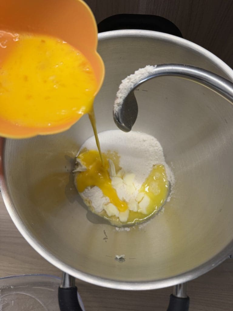 Schlagen Sie 3 mittlere Eier in einer separaten Schüssel auf und wiegen Sie 175 g ab. Es ist sehr wichtig, genau bei der Eiermenge zu sein, da das Rezept ansonsten nicht die richtige Konsistenz erhält.