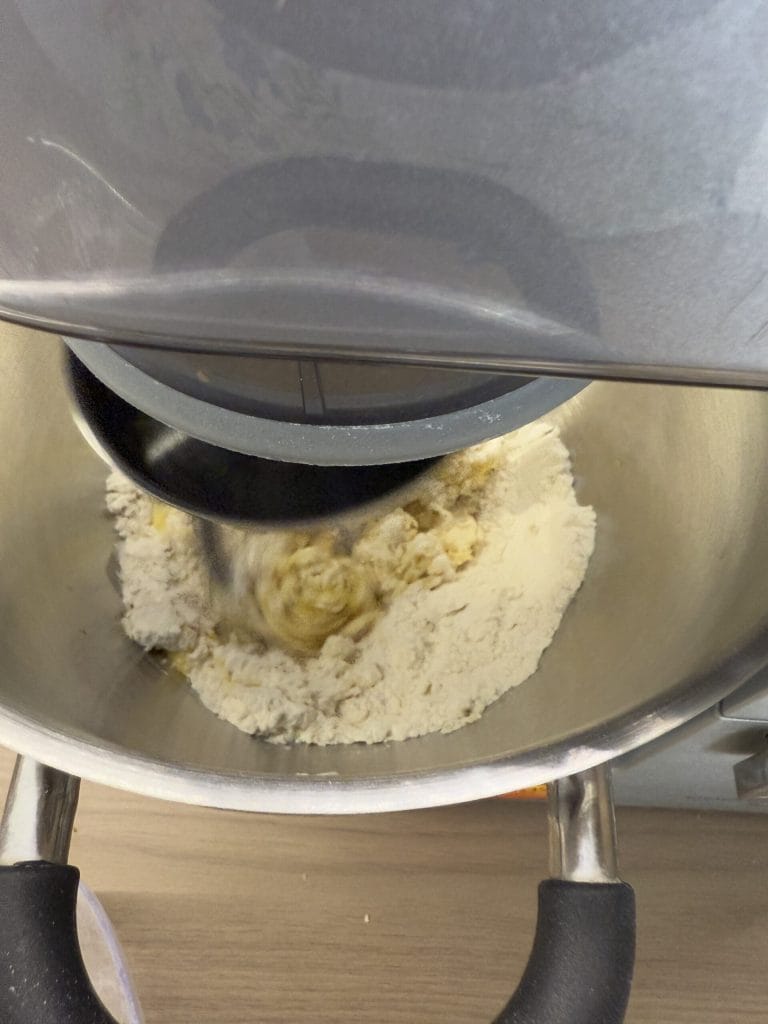 Nehmen Sie den Teig aus der Schüssel der Küchenmaschine, drücken Sie ihn auf eine Dicke von ca. 1-1,5 cm und wickeln Sie ihn in Frischhaltefolie.