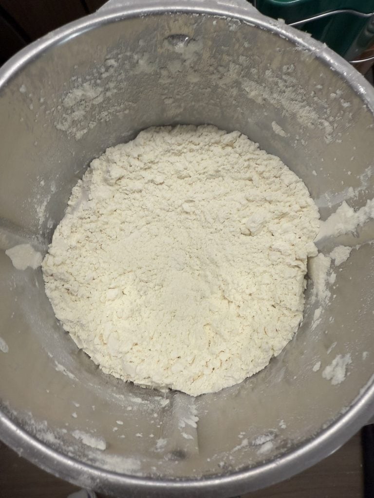 Geben Sie Mehl und Puderzucker in den Mixbehälter (oder die Schüssel).