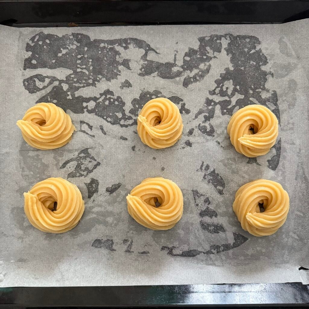 Geben Sie den Brandteig in einen Spritzbeutel mit großer Sterntülle und machen Sie zwei Runden Teig übereinander. Machen Sie sie nicht zu groß, da der Teig beim Backen aufgehen wird, und lassen Sie vor allem genügend Abstand zwischen den Zeppole auf dem Backblech.