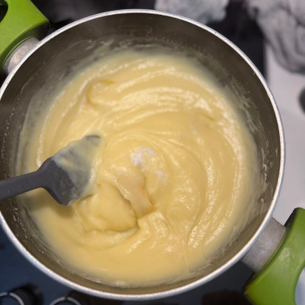 Während Ihre Zeppole abkühlen, bereiten Sie eine dickere und strukturiertere Puddingcreme zu als die klassische, da sie die Form des Kleckses auf der Zeppola behalten muss.
