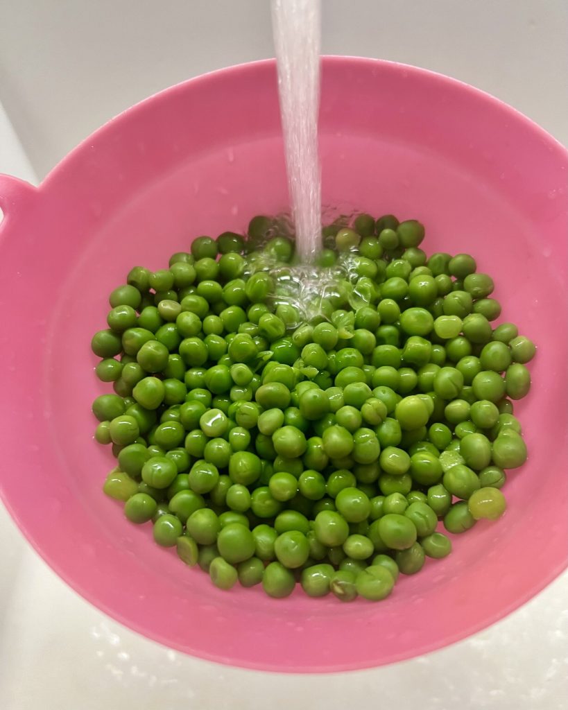 • In einem separaten Topf bringen wir etwas leicht gesalzenes Wasser zum Kochen und geben die Erbsen hinzu. Blanchieren Sie sie für 3-4 Minuten.
