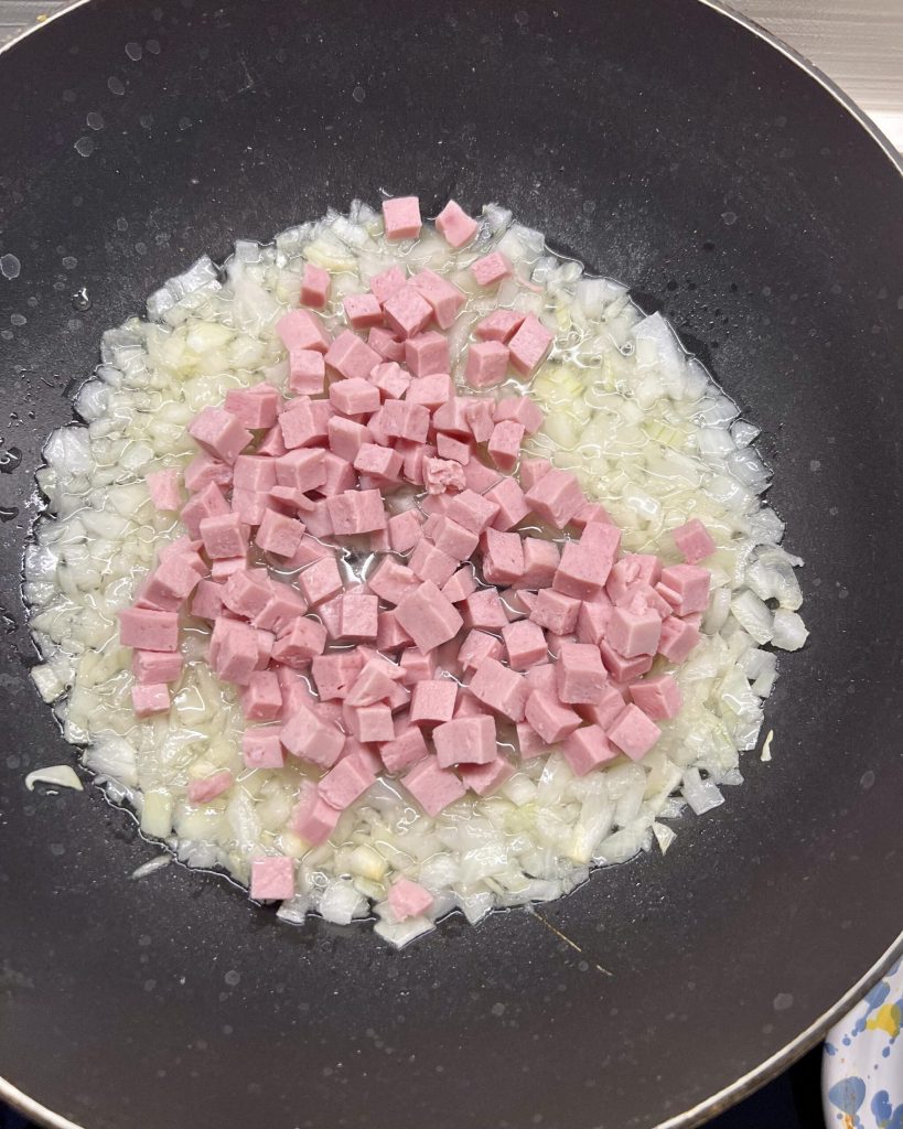 • Fügen Sie die Schinkenwürfel in die Pfanne und setzen Sie das Kochen bei mäßiger Hitze für einige weitere Minuten fort.