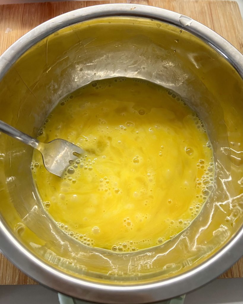 • Schlagen Sie die Eier in einer Schüssel auf und verrühren Sie sie schnell mit einer Gabel.
