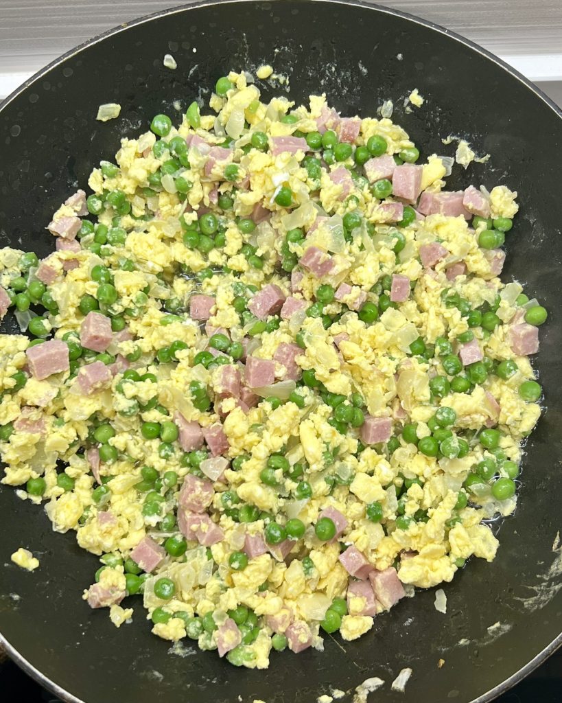 • Nach einigen Minuten fügen Sie die Erbsen hinzu und setzen das Kochen fort, bis die Eier vollständig gestockt sind.