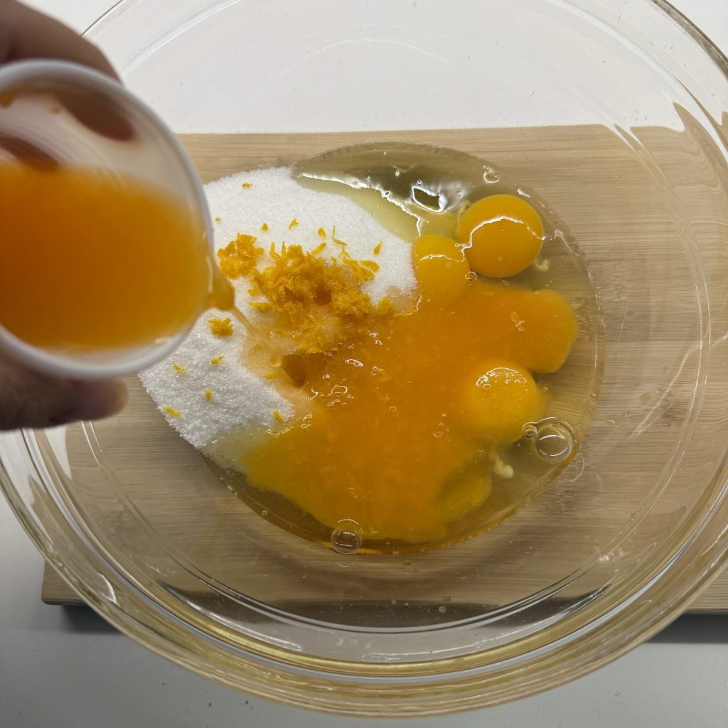 Ich empfehle, auch das Fruchtfleisch hinzuzufügen, das in der Zitruspresse zurückbleibt, da der Kuchen dadurch noch duftender wird. Beiseite stellen.