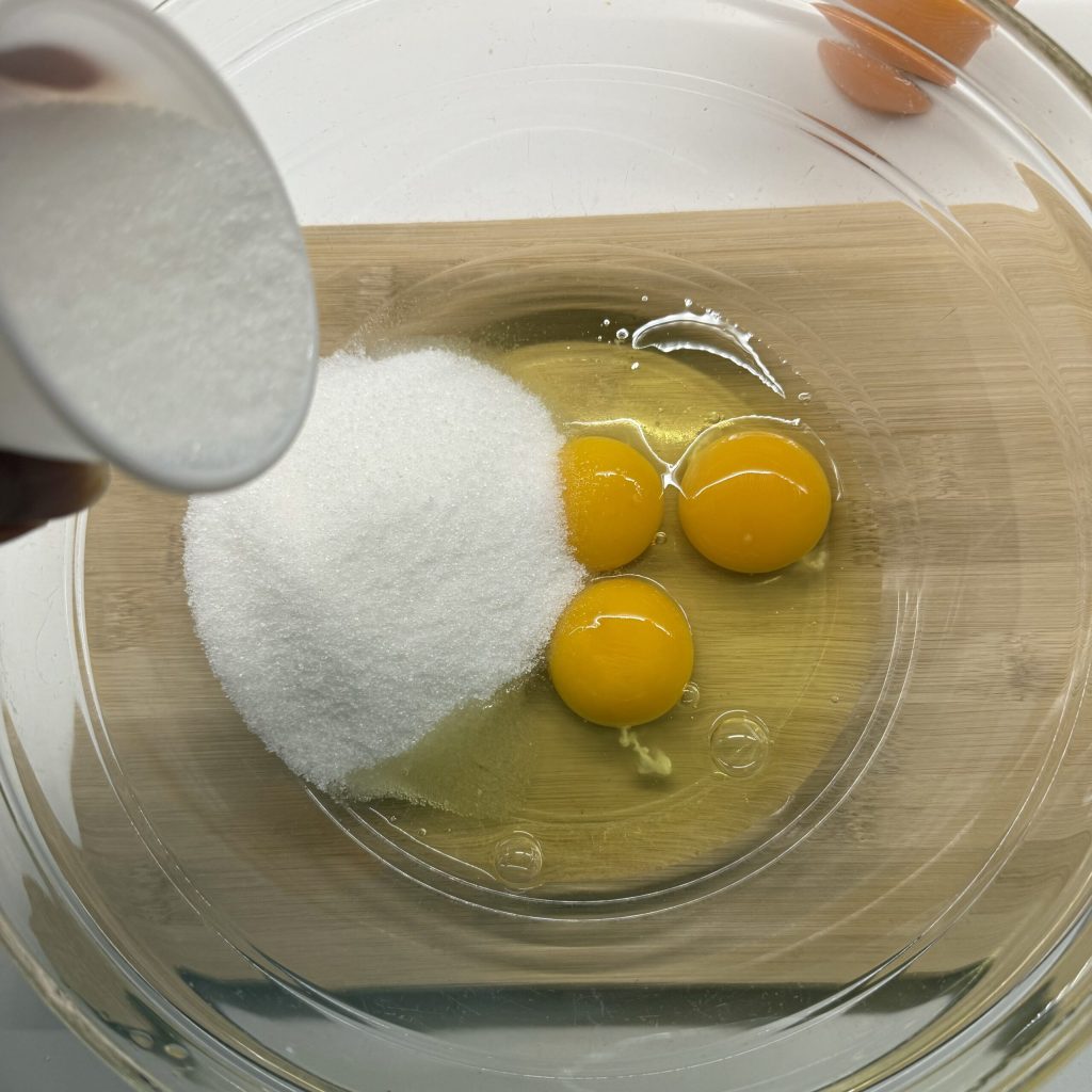 Geben Sie in eine Schüssel die Eier und den Zucker. Wenn Sie einen weniger süßen Kuchen bevorzugen, empfehle ich, nur anderthalb Becher Zucker hinzuzufügen, besonders wenn die verwendeten Mandarinen süß und saftig sind.