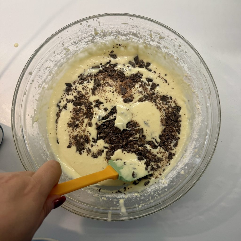 • Fügt die gehackte Schokolade zur Mischung hinzu.