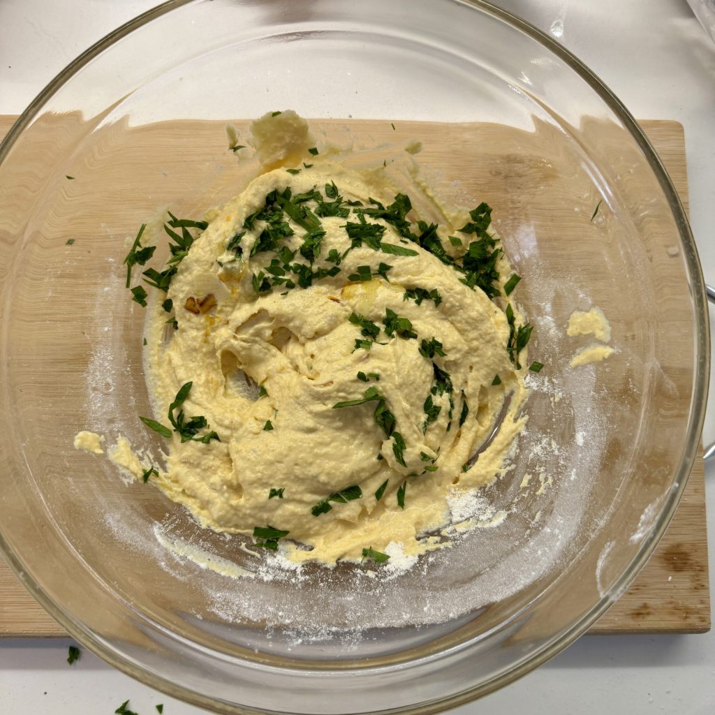 Fügen Sie Salz, Pfeffer, gehackte Petersilie, Mehl und Käse hinzu: 20 Sek. Stufe 3 mischen. Sie erhalten eine weiche Masse. Wenn Sie Schinken in Stücken (Speck, Bauchspeck oder Salami) hinzufügen möchten, fügen Sie sie in diesem Schritt hinzu.