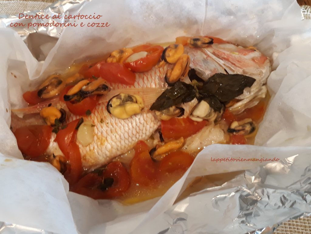 Im vorgeheizten Ofen bei 180° auf einem Backblech etwa 20 Minuten backen, wenn der Fisch etwa 600/700 Gramm wiegt, sonst dauert es 30/40 Minuten. Servieren Sie Ihre Dorade in Folie mit Kirschtomaten und Miesmuscheln, sehr heiß und mit der ganzen Folie.