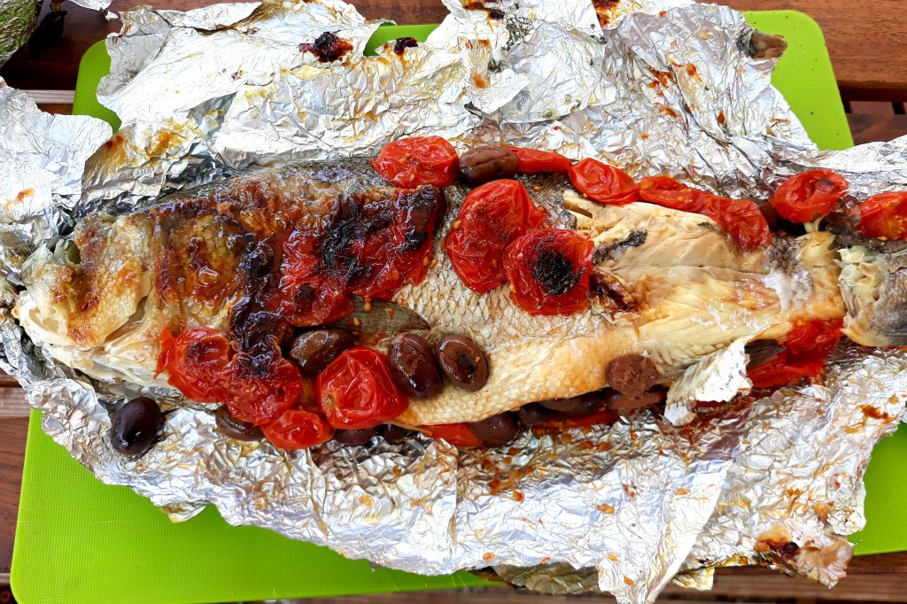 Die Seebrassen-Papillote in der Pfanne wird normalerweise im Ofen oder auf dem Grill zubereitet, aber da ich im Bungalow nicht die Möglichkeit dazu habe, habe ich mich entschieden, sie in der Pfanne zuzubereiten. Am Ende muss ich sagen, dass es im Sommer so besser ist. Der Ofen hätte die Küche sicher zu sehr erhitzt… das Ergebnis ist jedoch das gleiche… von unendlicher Köstlichkeit… vor allem, weil die Seebrasse, die ich auf dem Markt in Trogir gekauft habe, gefangen und nicht gezüchtet ist… in Italien hätte sie viel, viel mehr gekostet!!!