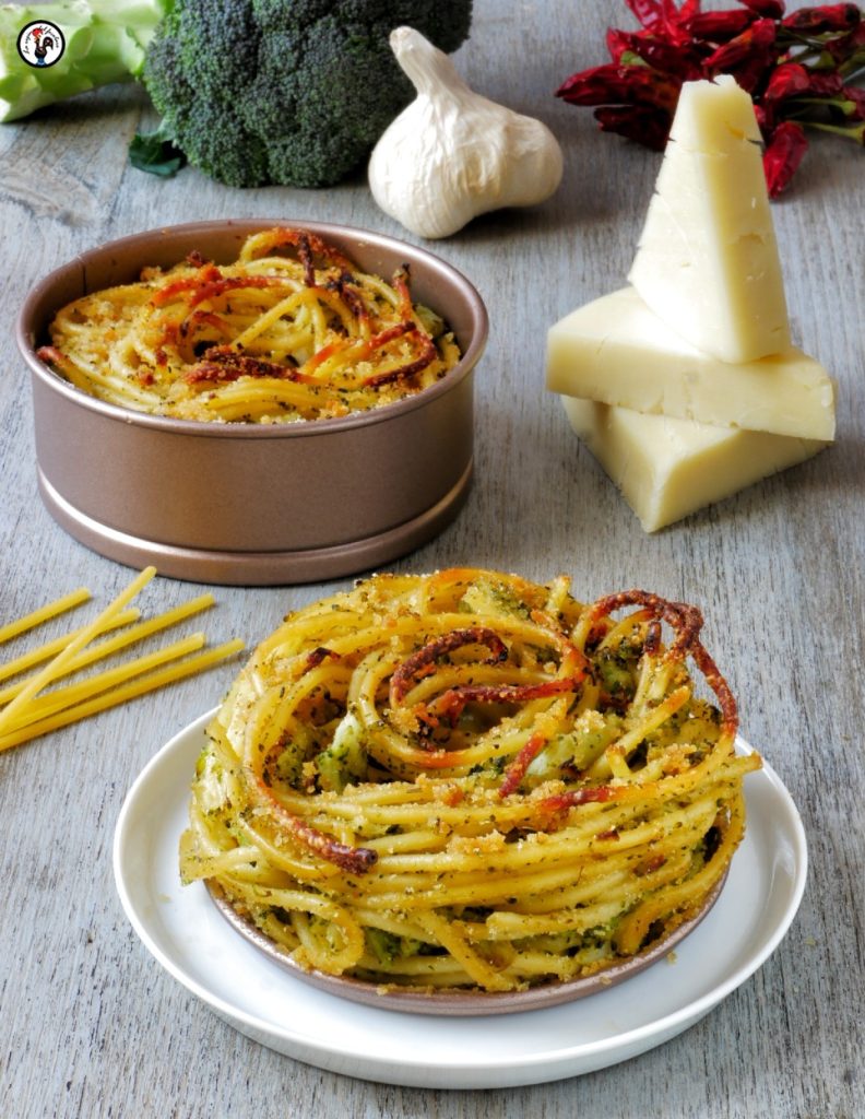 Wir gießen die Bucatini ab und würzen sie direkt in der Pfanne mit den sautierten Broccoletti (denken Sie daran, die Knoblauchzehen und den Chili zu entfernen, wenn wir ihn ganz hineingelegt haben). Wir fügen das geröstete Brot hinzu, nicht alles auf einmal, sondern nach und nach; die Bucatini sollten sandig sein. Wir geben auch die kleinen Stücke des milden Provolone hinzu. Dann legen wir die Bucatini mit Hilfe einer Gabel in die Form, um ein Nest zu bilden. In die Mitte fügen wir einige der größeren Käsestücke, die wir aufbewahrt haben, hinzu. Schließlich streuen wir noch eine kleine Menge der gewürzten Semmelbrösel und ein kleines Pastaknäuel darüber, um es zu verschließen.Für die finale Kruste: etwas Brot, eine Prise geriebener Provolone oder Hartkäse und ein Schuss Öl.