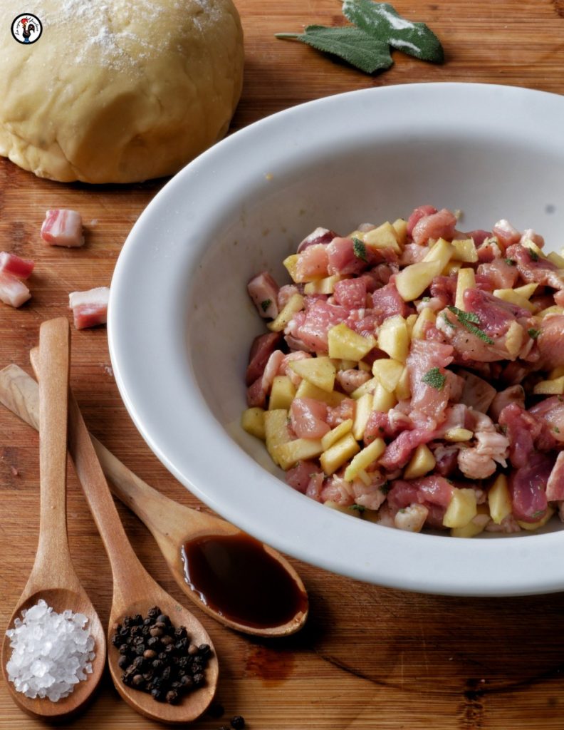 Wir schneiden das Schweinefleisch, den Speck und die geschälten Äpfel in sehr kleine Würfel. Wir mischen alles in einer großen Schüssel und würzen mit Salz, Pfeffer und Worcestershire-Sauce oder Ketchup. Wir fügen den frisch gehackten Salbei hinzu, der ein köstliches Aroma verleiht.